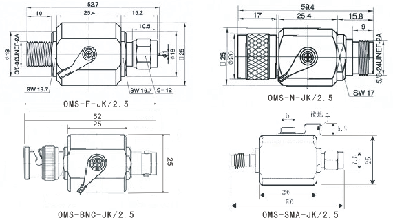 產品型號 | OMS-SMA-JK/2.5 | OMS-N-JK/2.5 | OMS-TNC-JK/2.5 | OMS-F-JK/2.5 | |
