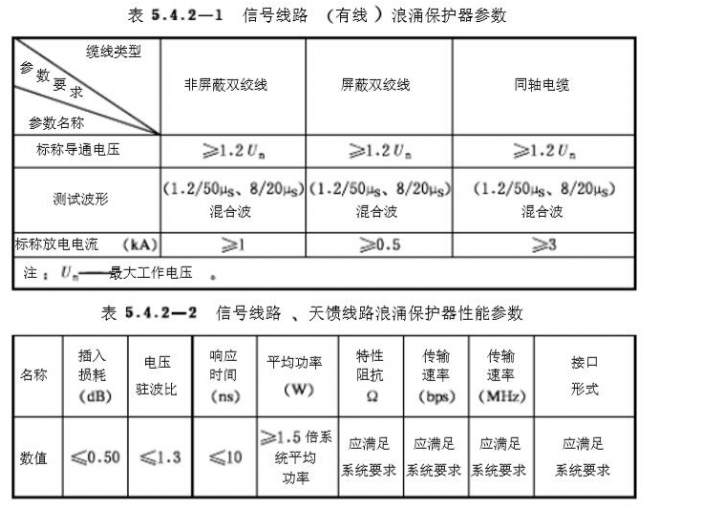 2.電子信息系統(tǒng)信號(hào)線路浪涌保擴(kuò)器的選擇,應(yīng)根據(jù)線路的工作頻率,傳輸介質(zhì),傳輸速率,傳輸寬帶,工作電壓,接口形式,特性阻抗等參數(shù),選用電壓駐波比和插入損耗小的適配的浪涌保護(hù)器.信號(hào)線路浪涌保護(hù)器參數(shù)應(yīng)符合表5.4.2-1,5.4.2-2的規(guī)定